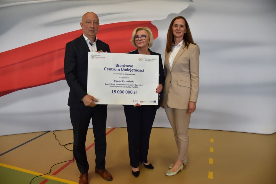 Wczoraj (04.09.2023 r.) podczas uroczystego rozpoczęcia roku szkolnego, które odbyło się w Dolnośląskim Zespole Szkół w Biedrzychowicach, Starosta Zgorzelecki Artur Bieliński oraz Dyrektor ZSP w Zgorzelcu Monika Listwan, otrzymali czek na realizację zadania pn. „Utworzenia i wsparcie funkcjonowania Branżowego Centrum Umiejętności w Zgorzelcu” w dziedzinie energetyka. Projekt realizowany będzie w partnerstwie ze Stowarzyszeniem Elektryków Polskich. Czek wręczyła Sekretarz Stanu w Ministerstwie Edukacji i Nauki Marzena Machałek.